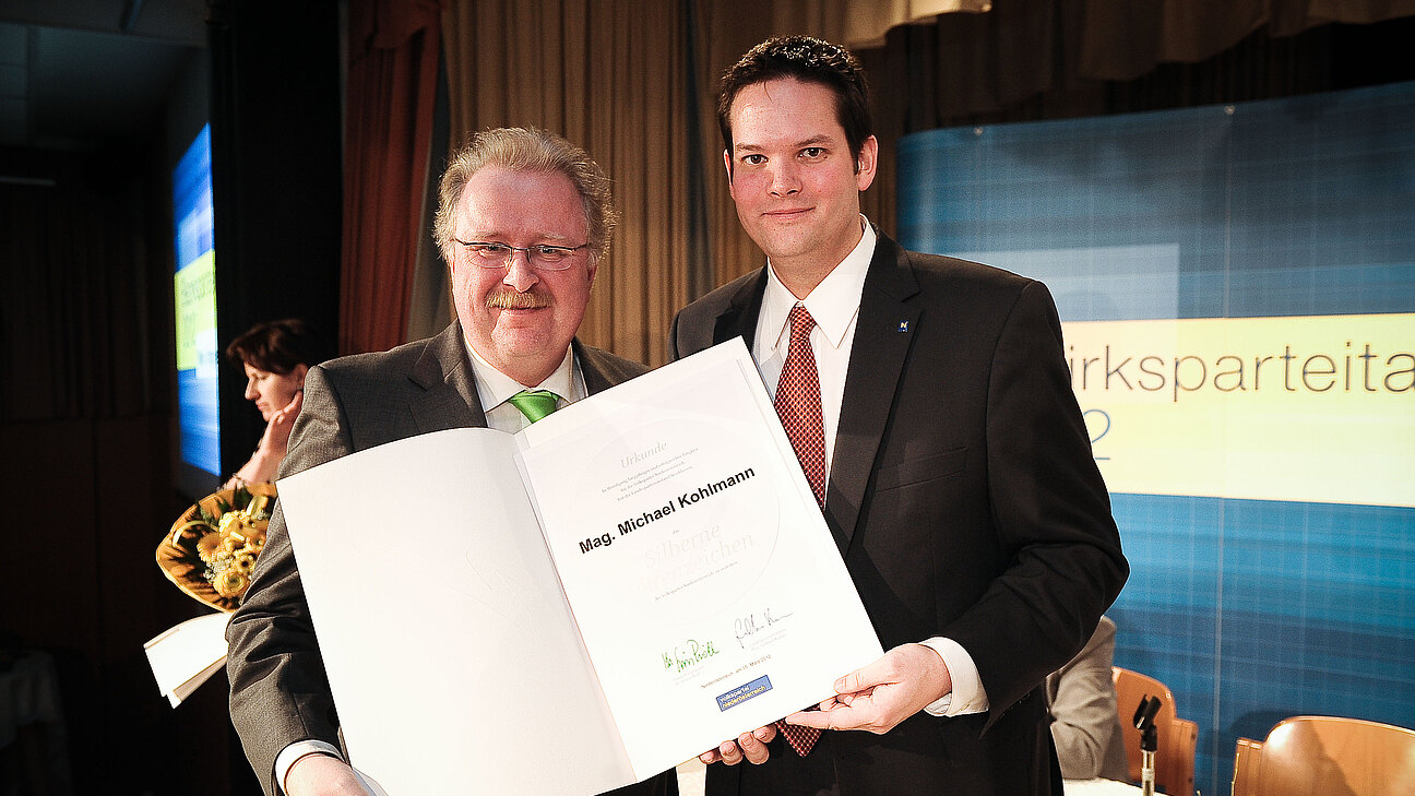 Mag. Michael Kohlmann ist seit genau zehn Jahren Bezirksgeschäftsführer der ÖVP Wien-Umgebung. Der Landesparteivorstand der ÖVP Niederösterreich hat nun beschlossen, Kohlmann das "Silberne Ehrenzeichen für Verdienste um die Volkspartei Niederösterreich" zu verleihen. Bezirksparteiobmann LAbg. Mag. Lukas Mandl überreichte Kohlmann das Ehrenzeichen im Rahmen des Bezirksparteitages.