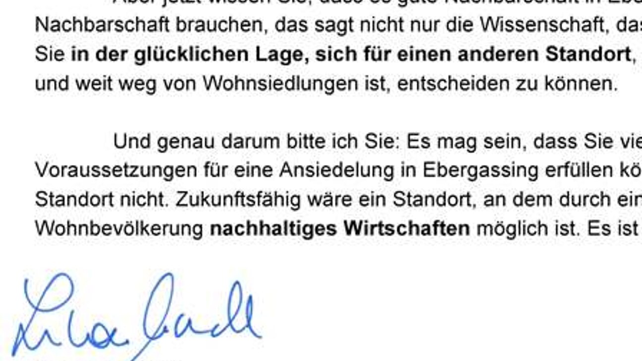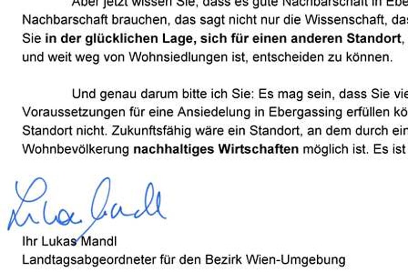 Die SPAR-AG braucht ein neues Logistikzentrum in Ostösterreich. „Es wäre eine falsche Entscheidung, dieses Logistikzentrum in Ebergassing anzusiedeln“, erklärt Lukas Mandl, Landtagsabgeordneter für den Bezirk Wien-Umgebung, in einem Offenen Brief an das Management der SPAR-AG. Hier der Offene Brief im Wortlaut:
