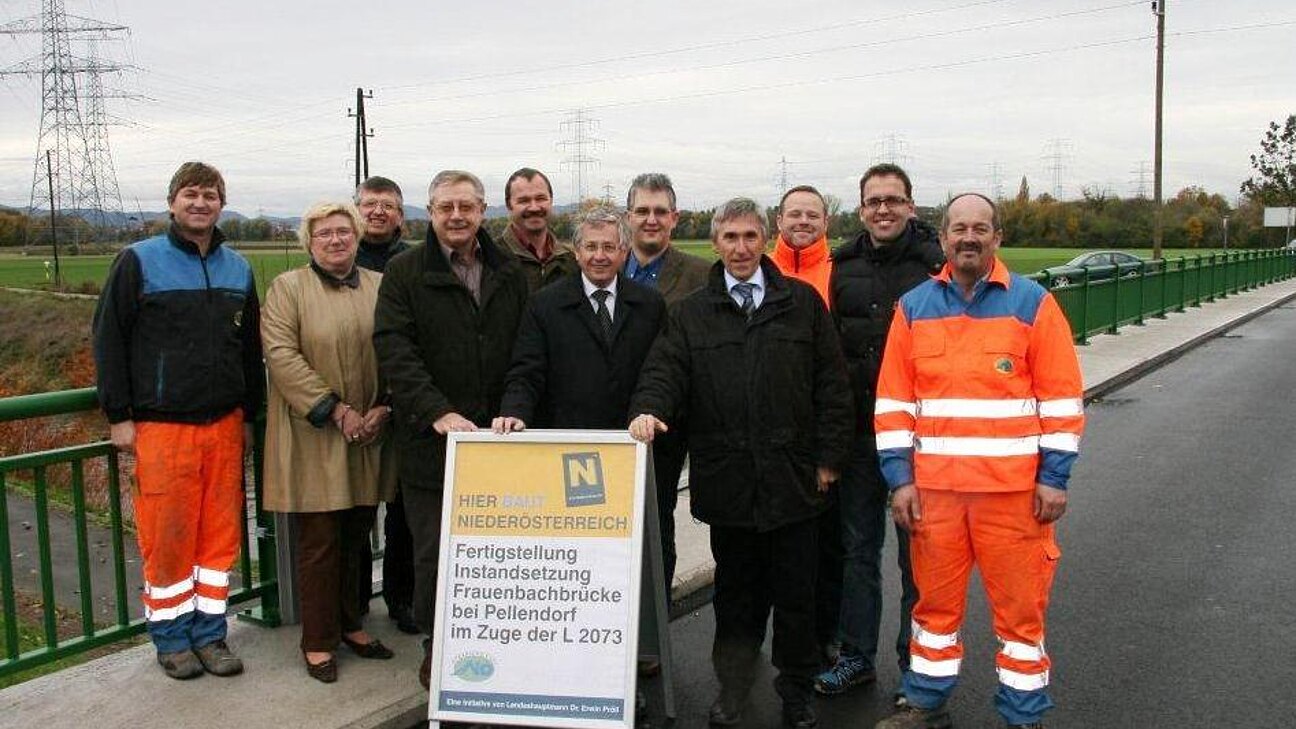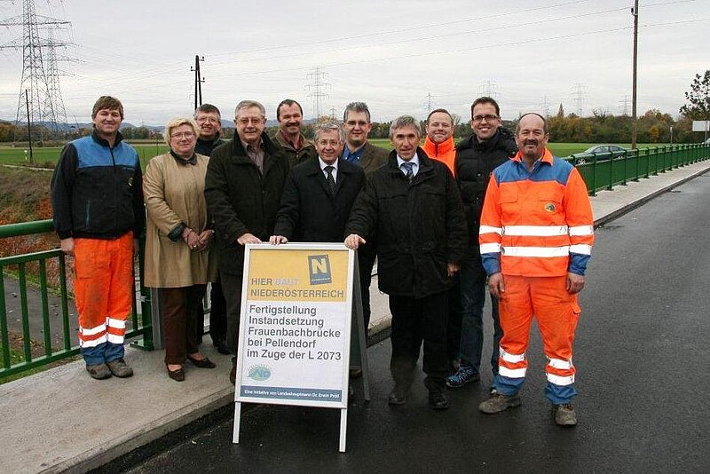 Die Hauptpunkte der Instandsetzungsarbeiten waren das Neuaufbringen der Tragwerksabdichtung, das Erneuern der bituminösen Beläge im Fahrbahnbereich und die Erneuerung des Gehsteiges (Randbalken). Weiters wurden Fehlstellen am Tragwerk und Widerlager instandgesetzt und betreffend Sicherheit wurde das Stahlgeländer auf neuesten Stand gebracht und über dem Radweg ein Spritzschutz hergestellt. Die Bauarbeiten wurden in einem Zeitraum von 12 Wochen von der Firma STRABAG AG, aus St. Martin durchgeführt. Für die Instandsetzung des Brückendecks war eine halbseitige Sperre erforderlich. Die Gesamtbaukosten belaufen sich auf rund € 220.000.- und werden zur Gänze vom Land NÖ getragen. "Das Land NÖ ist stets bemüht, die Sicherheit der Verkehrsteilnehmer auf den Landesstraßen immer wieder zu erhöhen. In diesem Fall ist es die Komplett-Sanierung der fast 40 Jahre alten Frauenbachbrücke zwischen Pellendorf und Lanzendorf. Dabei wurde auch auf die unterhalb der Brücke querenden Radfahrer Rücksicht genommen. So wurde beim Brückengeländer ein entsprechender Spritzwasserschutz angebracht," so Landtagsabgeordneter DI Willi Eigner.