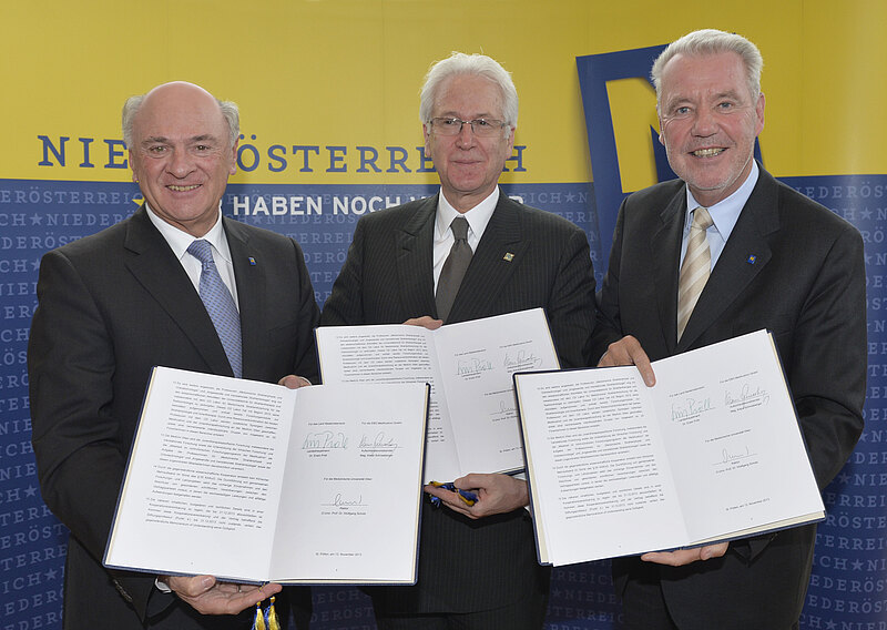 Im Landhaus in St. Pölten kam es heute, Mittwoch, zur Vertragsunterzeichnung zwischen dem Land Niederösterreich und der MedUni Wien betreffend das MedAustron-Projekt in Wiener Neustadt. Schwerpunkt des „Memorandum of understanding" sind zwei Professuren: Zum einen für Strahlenphysik und Onkotechnologie, zum anderen für Strahlenbiologie. Eine Professur wird durch die Medizinische Universität finanziert, die andere durch das Land Niederösterreich. Die Kosten dafür belaufen sich auf 350.000 Euro pro Professur und Jahr. Landeshauptmann Dr. Erwin Pröll sprach im Zuge des Pressegespräches von einem „sehr wichtigen Schritt". Man sei dankbar, mit der MedUni Wien einen international anerkannten Partner zu haben. Das MedAustron-Projekt brauche beste medizinische und wissenschaftliche Begleitung, diese sei durch die MedUni Wien gesichert. MedAustron biete „Krebstherapie und Krebsforschung von internationalem Spitzenformat", man stärke damit auch die Wahrnehmung Niederösterreichs auf internationaler Ebene, so Pröll, der in diesem Zusammenhang auch die Zusammenarbeit mit dem CERN und der Technischen Universität Wien hervorhob. Mit dem MedAustron-Projekt sei man auch, was den zeitlichen Ablauf und die Kosten betreffe „voll im Plan", betonte der Landeshauptmann. „Bereits jetzt arbeiten dort 116 Mitarbeiter und wir werden aller Voraussicht nach 2015 die ersten Patienten behandeln können." Die Kosten für MedAustron werden rund 200 Millionen Euro betragen. Weiters sprach Pröll von einem „bedeutenden Zeichen für Krebstherapie und Krebsforschung". Im Vollbetrieb werde man rund 24.000 Bestrahlungsvorgänge pro Jahr durchführen können. Damit können rund 1.200 Krebspatienten pro Jahr behandelt werden. Der Rektor der MedUni Wien, Univ.Prof. Dr. Wolfgang Schütz, meinte, es sei für die Forschung wesentlich, bei diesem Projekt „von Anfang an dabei zu sein". Die Zusammenarbeit bei MedAustron sei eine Win-Win-Situation für das Land Niederösterreich, die MedUni Wien und die Technische Universität Wien. Die beiden Professuren sollen im nächsten Jahr besetzt werden, kündigte er an. MedAustron in Wiener Neustadt sei weltweit erst das vierte derartige Zentrum, betonte der Aufsichtsratsvorsitzende der Errichtungs- und Betriebsgesellschaft EBG MedAustron, Klubobmann Mag. Klaus Schneeberger. Bei Realisierung in rund zwei Jahren sei MedAustron sogar „das fortschrittlichste dieser Zentren, weil wir auf dem letzten technischen Stand sind und weil wir als unser Alleinstellungsmerkmal die wissenschaftliche Forschung auf Spitzenniveau implementieren."