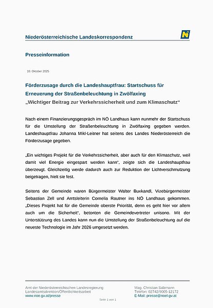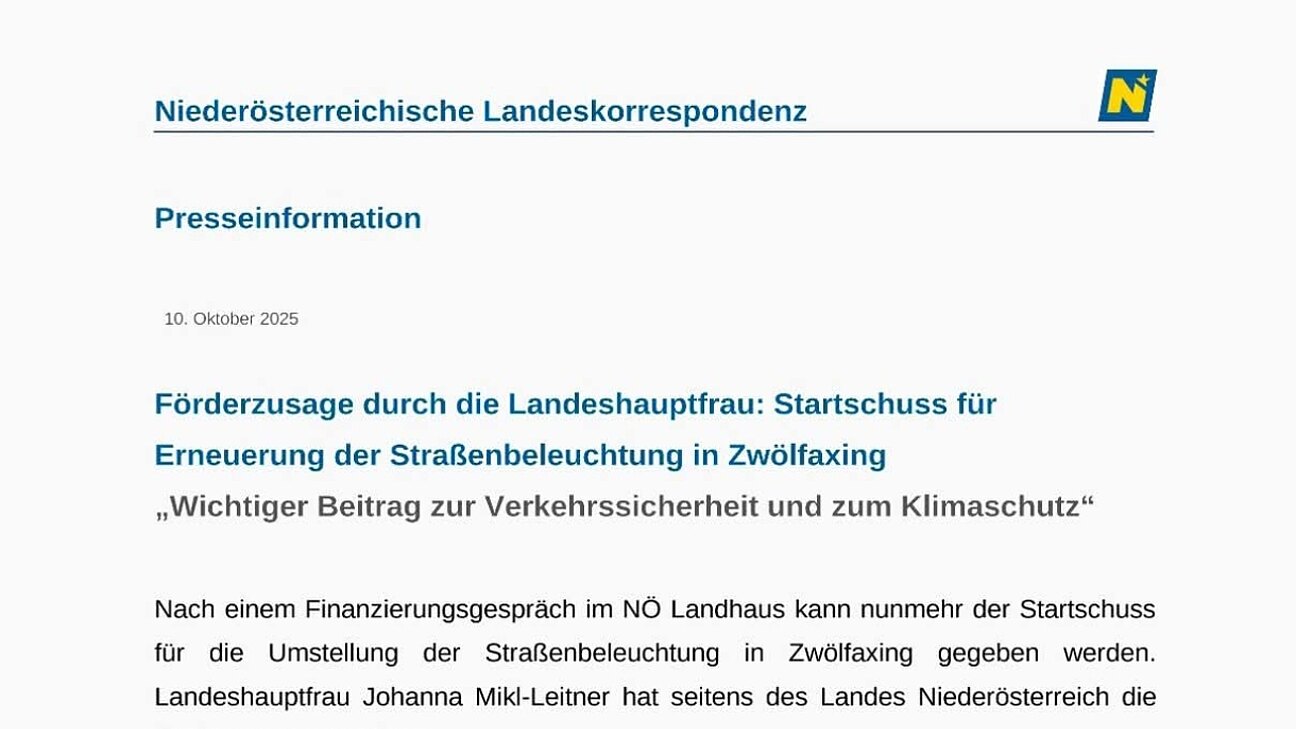 Wir sehen uns verpflichtet, gemeinsam zum Wohle und im Interesse der Gemeinde sowie aller Bürgerinnen und Bürger zu handeln. Daher haben wir zusammen mit unserem Koalitionspartner im Land Niederösterreich eine Förderung für die dringend notwendige Modernisierung und Erneuerung der öffentlichen Beleuchtung beantragt. Es ist uns gelungen, dafür eine Sonderförderung vom Land Niederösterreich zu erhalten; ohne diese wäre das Projekt nicht realisierbar gewesen. Wir danken daher Frau Landeshauptfrau Mag. Johanna Mikl-Leitner und dem Land Niederösterreich herzlich. So verstehen wir verantwortungsvolle Arbeit im Sinne der Gemeinde.
