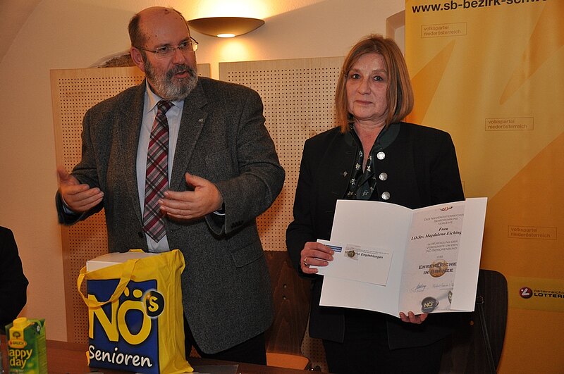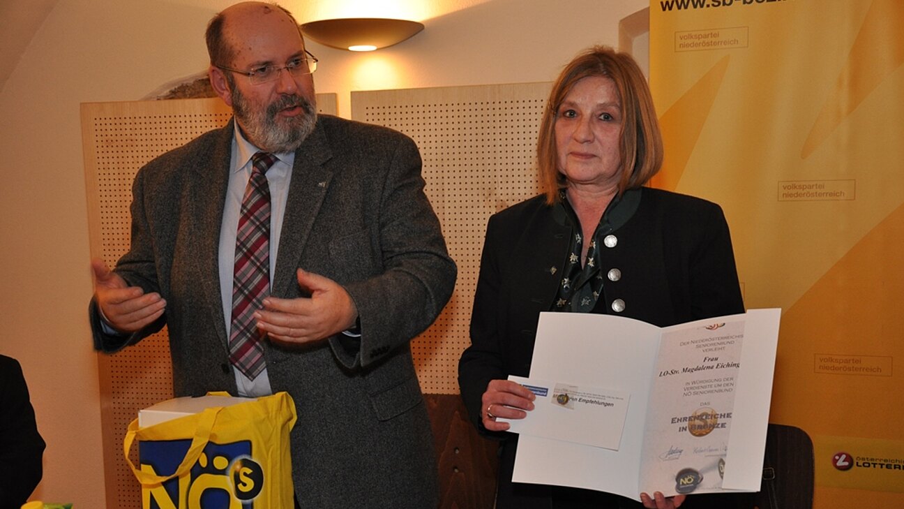 Mit beeindruckenden 100 % wurden Obfrau und Vorstand von den Delegierten gewählt. Die neu gewählte bzw. bestätigte Obfrau Magdalena Eichinger bedankte sich für das Vertrauen und für die gute Zusammenarbeit mit den Funktionären des Teilbezirksvorstandes, den Obleuten und den Ortsgruppen in der vorangegangenen Funktionsperiode. Sie gratuliert den neu gewählten Funktionären und freut sich auf die Fortsetzung dieser Arbeit in den nächsten vier Jahren. Als Stellvertreter wurden Dr. Rudolf Donninger, OSR Waltraud Rosner und OSR Franz Buchberger gewählt. Der komplette neue Vorstand - siehe nachstehend. Frau Helga Buchinger und Frau Silvia Resch, zwei scheidende ehemalige Vorstandsmitglieder, beide entschuldigt und leider nicht anwesend, haben als Dankeschön den vorbereiteten Blumengruß am Tag nach der Wahl zu Hause überreicht bekommen. Im Rahmen dieses Seniorentages überreichte Walter Hansy, Geschäftsführer des NÖ Seniorenbundes, der neu gewählten Obfrau, LO-Stv. Magdalena Eichinger, MBA, im Namen des Niederösterreichischen Seniorenbundes in Würdigung der Verdienste um den NÖ Seniorenbund, das Ehrenzeichen in Bronze. Der neue Vorstand NÖ SB Teilbezirk Schwechat: Obfrau: Magdalena Eichinger, MBA Obfrau Stv.: Dr. Rudolf Donninger