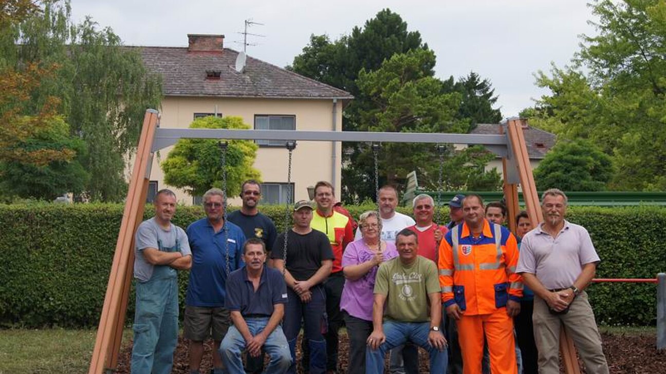Vergangenen Samstag fanden sich einige freiwillige Helfer, unter ihnen Bürgermeister Gerhard Schwarzmann und Vize Norbert Andrä, beim Spielplatz des Pfarrkindergartens ein. Dabei verteilten sie den von der Gemeinde gekauften neuen Rindermulch rund um die Spielgeräte.