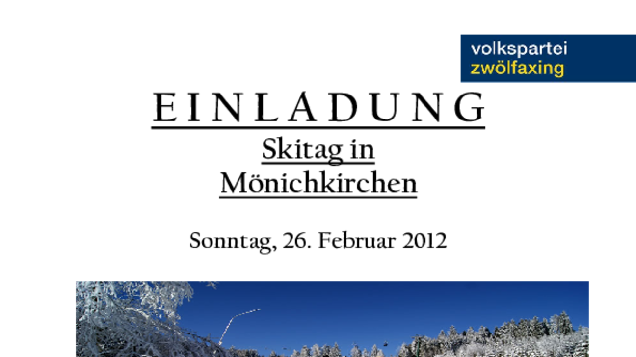 Busfahrt OHNE Tages-Skipass € 14,00/Person Busfahrt MIT Tages-Skipass € 44,00/Erwachsener € 41,50/Jugend € 30,00/Kind (unter 15 J.) Abfahrt: 7:30 Uhr am Hauptplatz Zwölfaxing Rückkehr: ca. 18:00 Uhr am Hauptplatz Zwölfaxing Auf Deine/Eure Teilnahme freut sich Das Team der ÖVP Zwölfaxing Anmeldung: 0664/ 26 13 527 (Gerhard Schwarzmann) 0664/ 555 15 21 (Sabine Schedl)