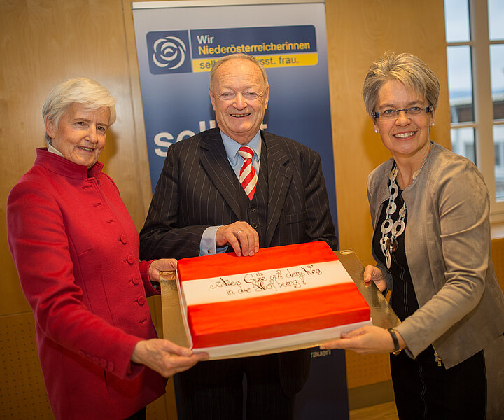 Auf seinem Weg in die Hofburg machte VP-Bundespräsidentschaftskandidat Dr. Andreas Khol mit seiner Gattin Heidi bei der Landesleitungssitzung der Wir Niederösterreicherinnen-ÖVP Frauen rund um Landesleiterin LR Dr.in Petra Bohuslav Station. Die zahlreichen Besucherinnen und Besucher lauschten als die Ehefrau des ÖVP-Politikers ihren Mann vorstellte. „Denn wer kann meinen Umgang mit Frauen besser beschreiben als meine Gattin“, schmunzelte Khol. Anschließend erklärte der Präsidentschaftskandidat, wie er im Fall seiner Wahl agieren wird: „Ich werde die Hofburg für alle Bürgerinnen und Bürger öffnen und auch in die Bundesländer hinausfahren. Ich will ein Bundespräsident zum Anfassen sein.“ Da der Weg in die Hofburg noch lange ist, überreichte Landesleiterin LR Bohuslav dem Kandidaten eine süße Stärkung: „Lieber Andreas, du kannst dich auf uns verlassen, Wir Niederösterreicherinnen-ÖVP Frauen werden dich auf deinem Weg in die Hofburg unterstützen und würden uns freuen, dich als Bundespräsident bei uns in Niederösterreich begrüßen zu dürfen“, so Landesleiterin Petra Bohuslav.