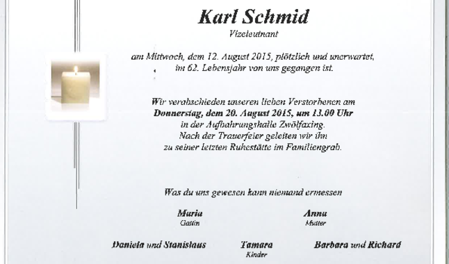 Karl Schmid verstarb am Mittwoch, 12.8.2015 plötzlich und unerwartet im Alter von 62 Jahren. Er war…